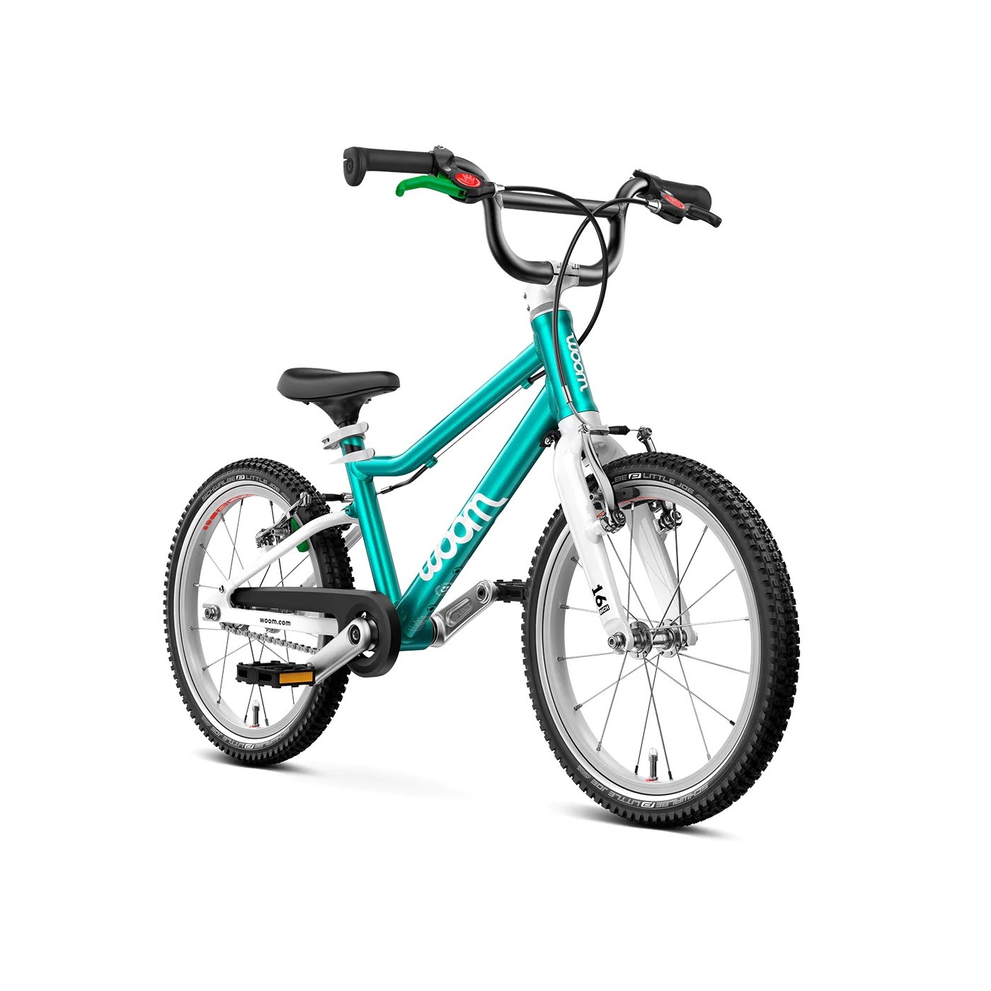 woom GO 3 został wyposażony w dwa mini V-brake, które działają lekko i precyzyjnie, zapewniając dziecku pełną kontrolę nad hamowaniem. Ergonomiczne klamki hamulcowe są dostosowane do dziecięcych dłoni, a zielona klamka tylnego hamulca pomaga intuicyjnie nauczyć się prawidłowego hamowania. Opony Schwalbe Little Joe z odblaskowymi paskami gwarantują świetną przyczepność i bezpieczeństwo w każdych warunkach.