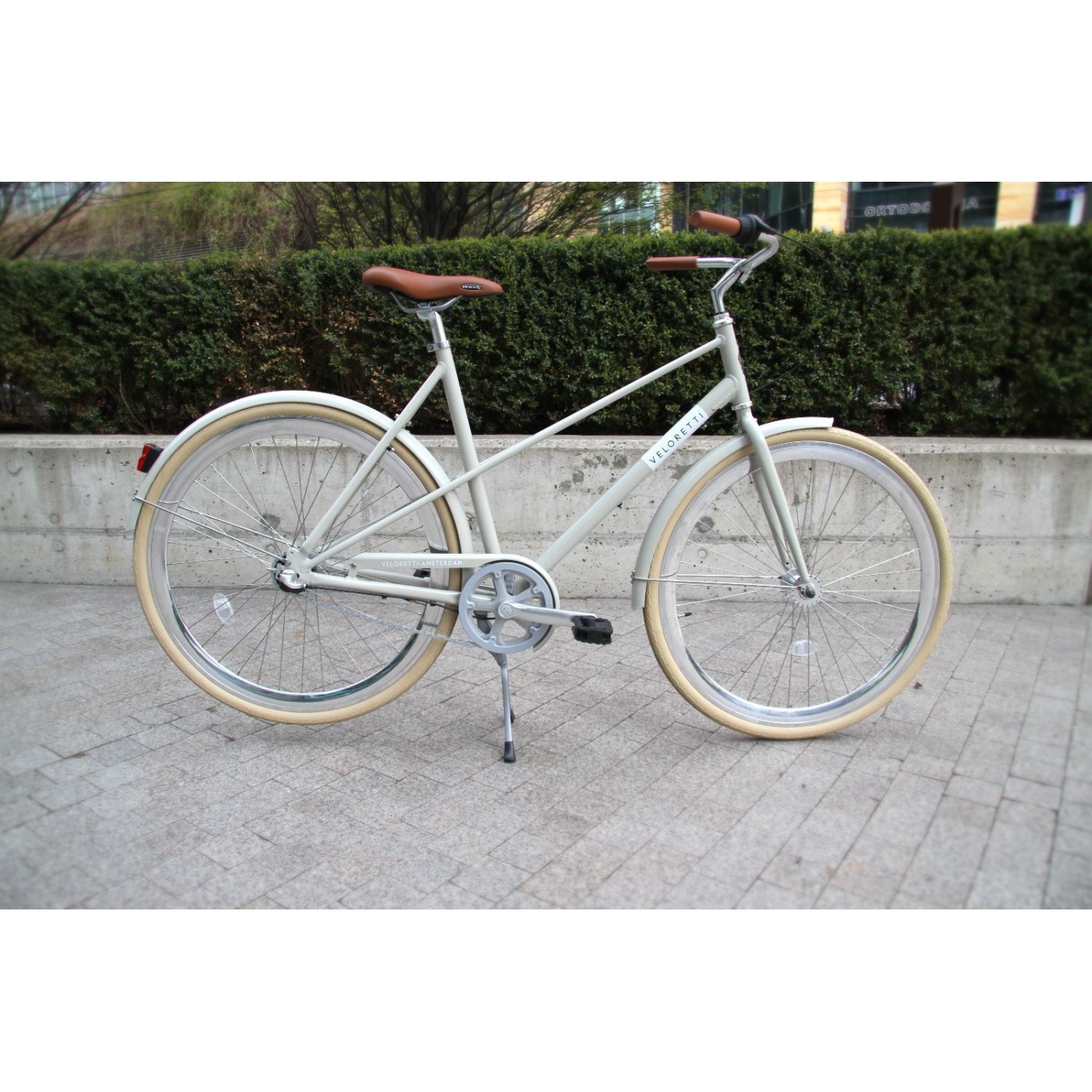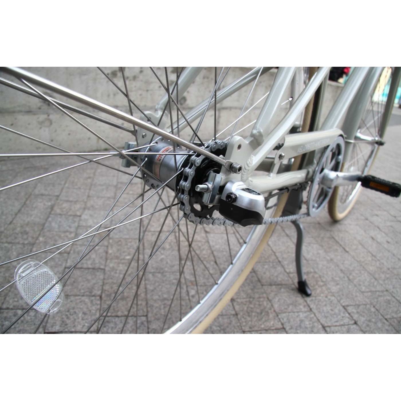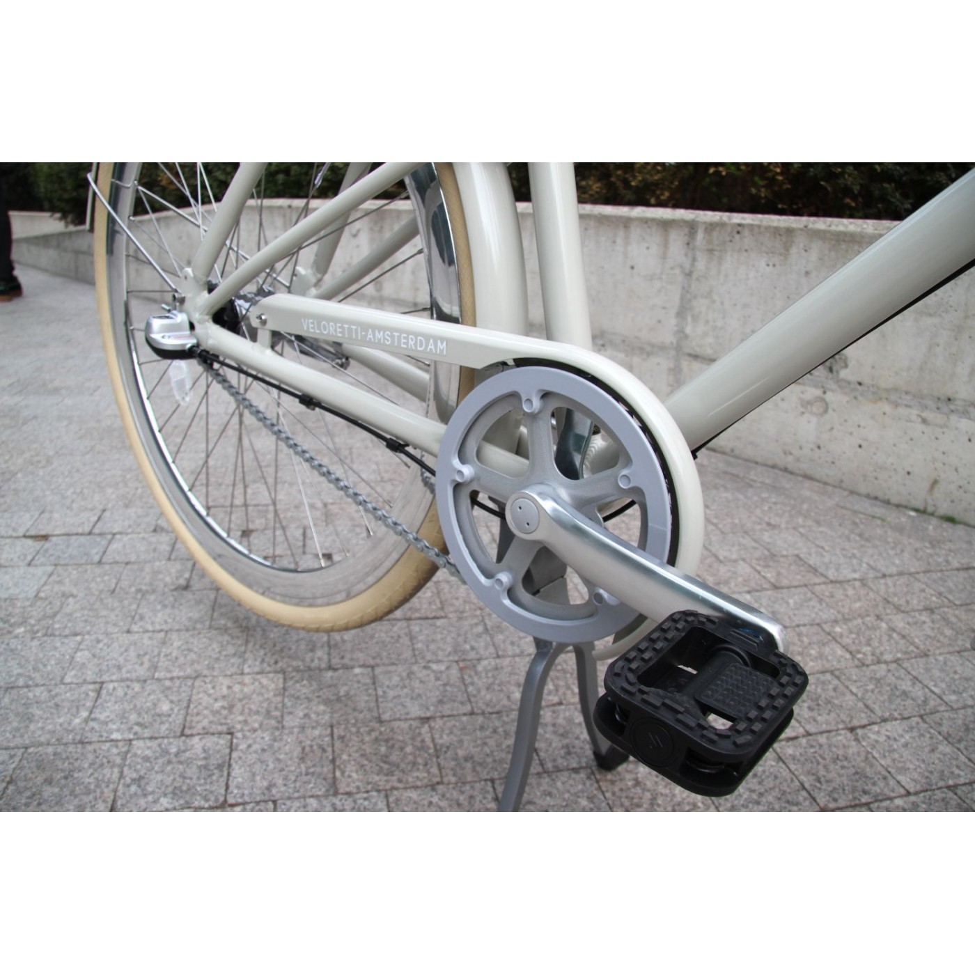 Szprychy ze stali nierdzewnej i połyskujące obręcze przyciągają wzrok i podkreślają styl roweru, a centralna nóżka pozwala stabilnie postawić go dokładnie tam, gdzie chcesz.